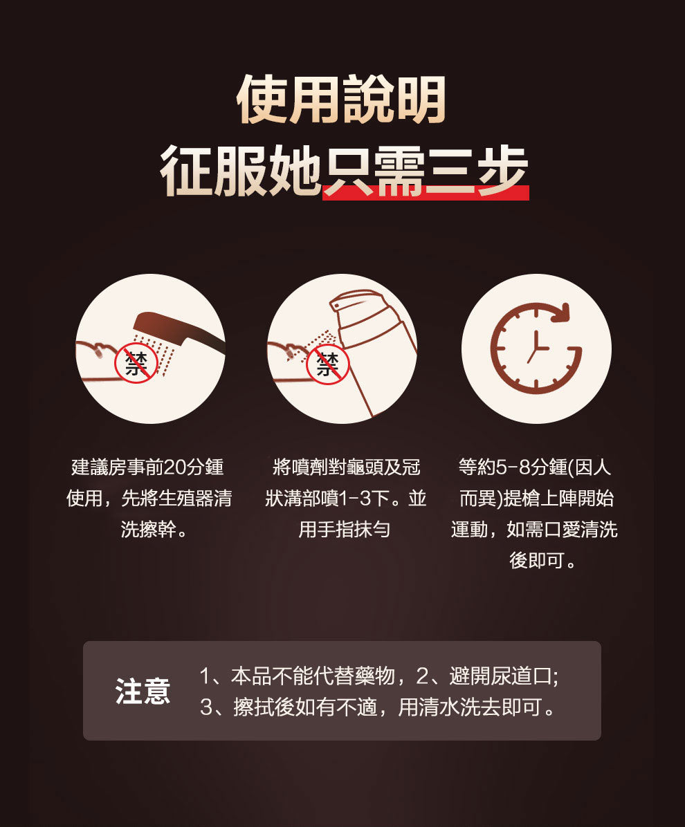 提前20分鐘使用,噴4-6下至龜頭與冠狀溝,塗抹均勻即可。如有口交需求,為了您和同伴的健康,建議辦事前先用清水沖洗,清水沖洗不會影響延時效果。