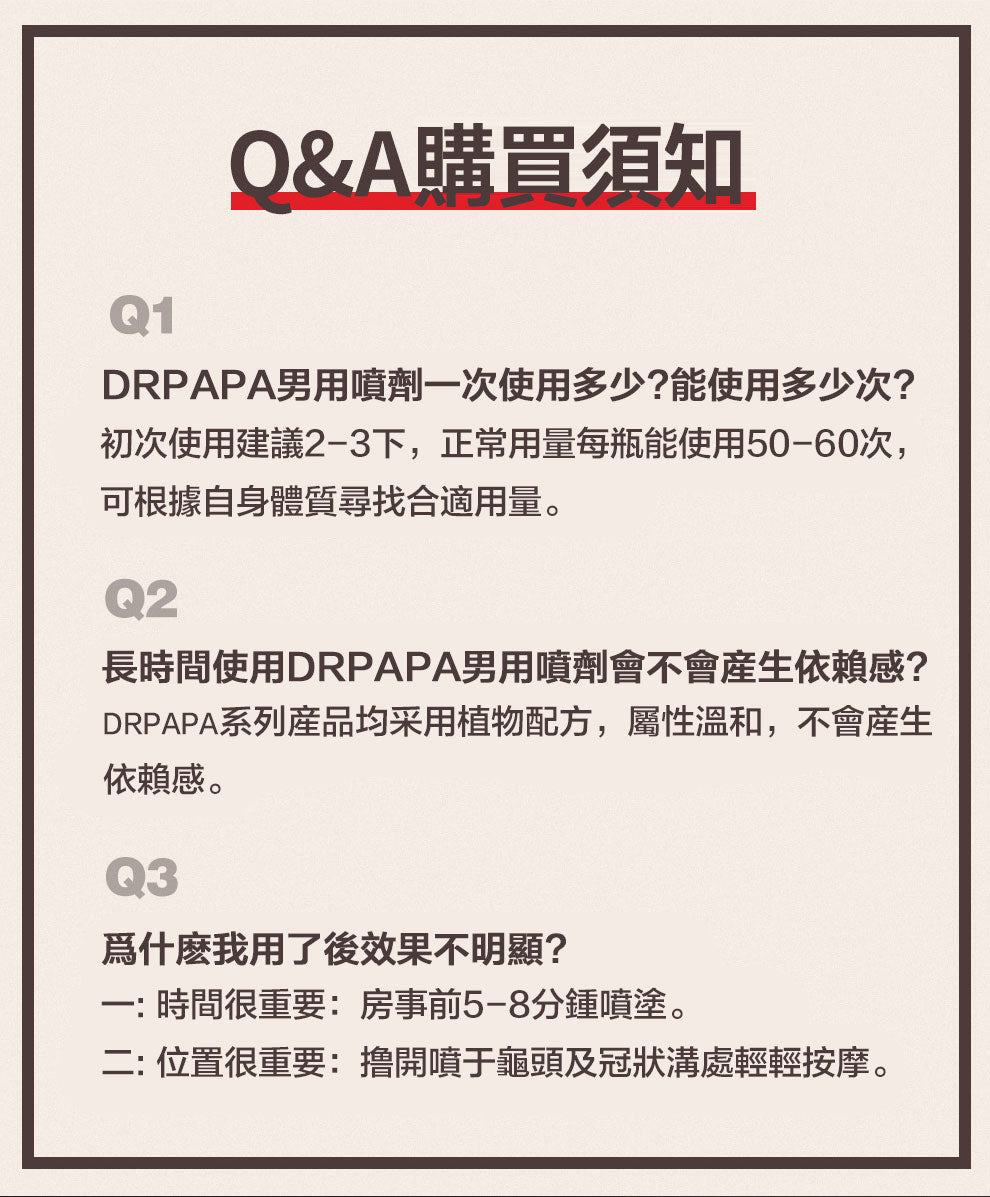 - 無刺激無副作用:DRPAPA一直以來都在堅持健康第一的機理,這款DRPAPA尊享版持久液採用植物成分配方,0麻醉成分,不損傷男女方身體,不影響快感