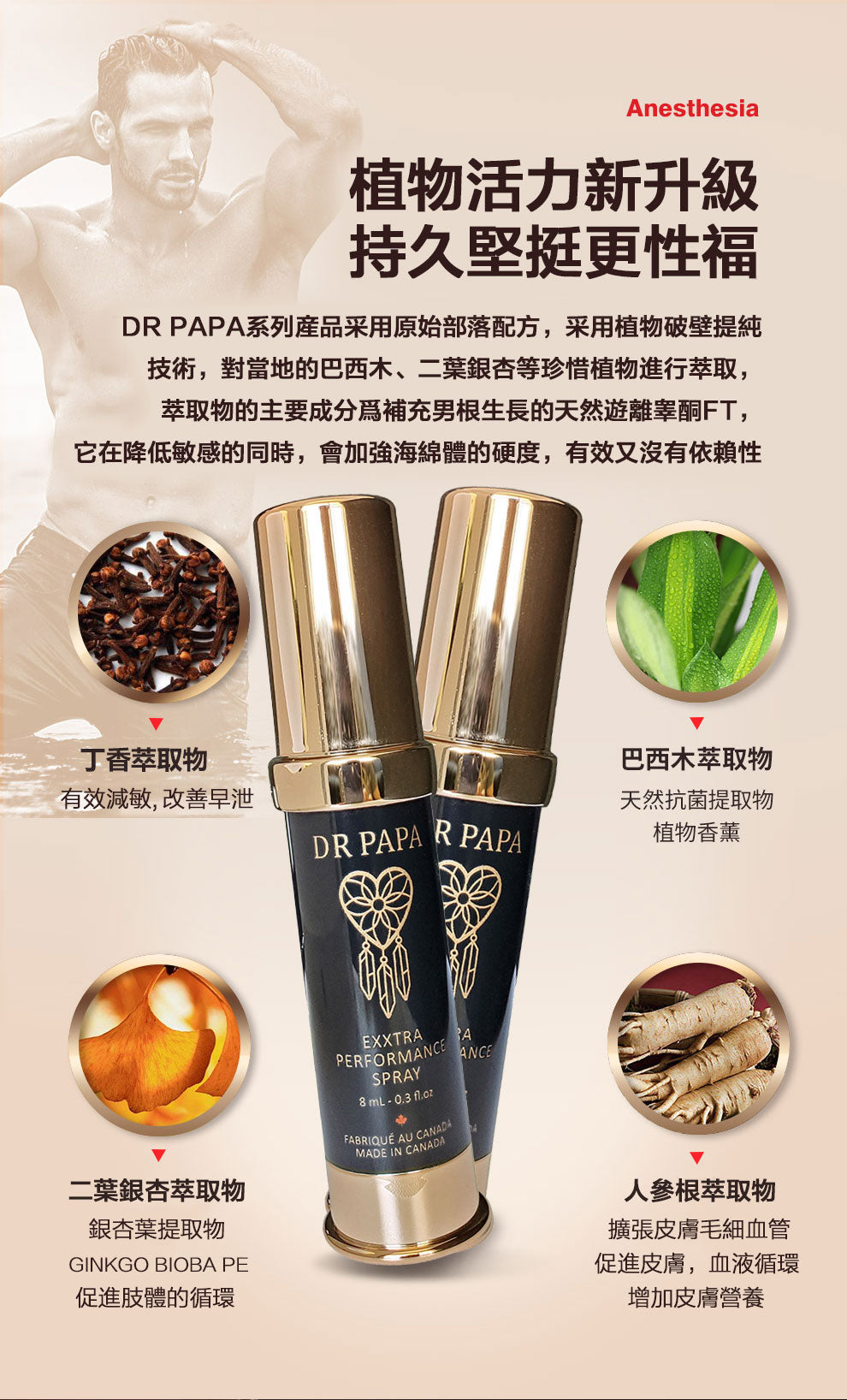 - 有效性:DRPAPA持久噴劑融合了丁香、巴西木、二葉銀杏、人參根等多種珍惜植物成分,在降低JJ敏感度的同時,可加強海綿體的硬體,變得持久堅挺